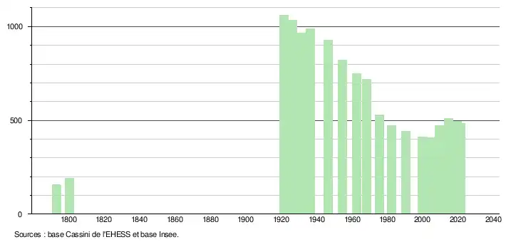 L'évolution du nombre d'habitants est connue à travers les recensements de la population effectués dans la commune depuis 1793. Pour les communes de moins de 10 000 habitants, une enquête de recensement portant sur toute la population est réalisée tous les cinq ans, les populations légales des années intermédiaires étant quant à elles estimées par interpolation ou extrapolation[7]. Pour la commune, le premier recensement exhaustif entrant dans le cadre du nouveau dispositif a été réalisé en 2004[8].