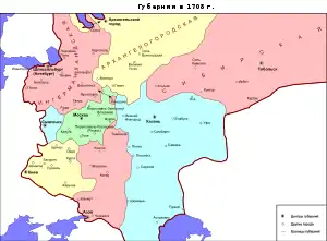En 1719, les gouvernements sont divisés en provinces (провинции, provintsii) ou en ouïezd (уе́зд). Le nombre de gouvernements est par la suite porté à 23.
