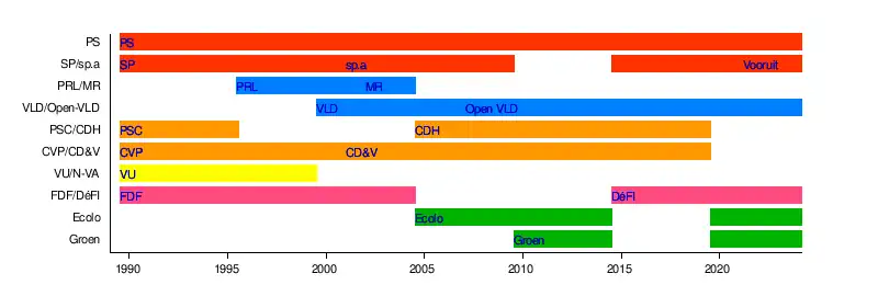 GroenEcoloDéFIDéFIVolksunieChristen-Democratisch en VlaamsChristen-Democratisch en VlaamsCentre démocrate humanisteCentre démocrate humanisteOpen Vlaamse Liberalen en DemocratenOpen Vlaamse Liberalen en DemocratenMouvement réformateur (Belgique)Parti réformateur libéral (Belgique)Vooruit (parti politique)Socialistische Partij AndersSocialistische Partij AndersParti socialiste (Belgique)