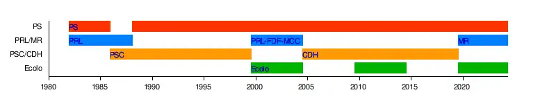 | 10e législature | Gouvernement Jeholet | Depuis le (4 ans, 6 mois et 28 jours) |