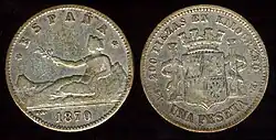 Le ministre des Finances du gouvernement provisoire crée également la nouvelle unité monétaire, la "peseta", et met en œuvre une politique de libre-échange dans le commerce extérieur, comme la réduction des droits de douane[19], qui est limitée par l'opposition des industriels catalans qui défendent le protectionnisme.
