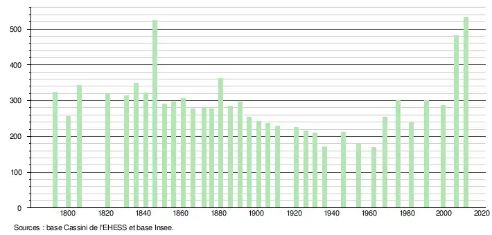 L'évolution du nombre d'habitants est connue à travers les recensements de la population effectués dans la commune depuis 1793. À partir du , les populations légales des communes sont publiées annuellement dans le cadre d'un recensement qui repose désormais sur une collecte d'information annuelle, concernant successivement tous les territoires communaux au cours d'une période de cinq ans. Pour les communes de moins de 10 000 habitants, une enquête de recensement portant sur toute la population est réalisée tous les cinq ans, les populations légales des années intermédiaires étant quant à elles estimées par interpolation ou extrapolation[4]. Pour la commune, le premier recensement exhaustif entrant dans le cadre du nouveau dispositif a été réalisé en 2006[5],[Note 1].
