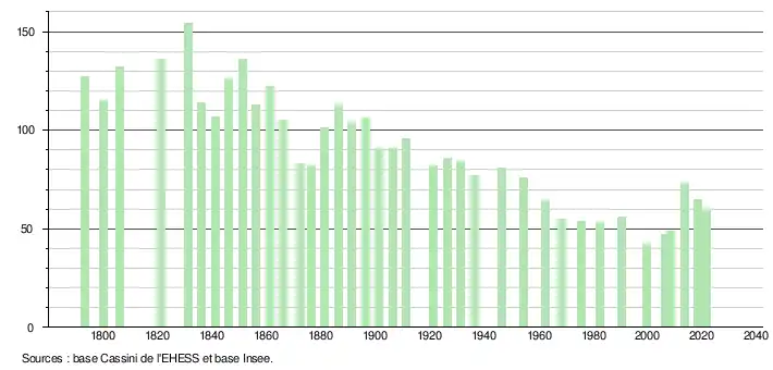 L'évolution du nombre d'habitants est connue à travers les recensements de la population effectués dans la commune depuis 1793. Pour les communes de moins de 10 000 habitants, une enquête de recensement portant sur toute la population est réalisée tous les cinq ans, les populations légales des années intermédiaires étant quant à elles estimées par interpolation ou extrapolation[17]. Pour la commune, le premier recensement exhaustif entrant dans le cadre du nouveau dispositif a été réalisé en 2008[18].
