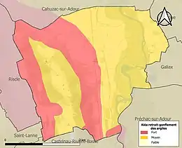 Le retrait-gonflement des sols argileux est susceptible d'engendrer des dommages importants aux bâtiments en cas d’alternance de périodes de sécheresse et de pluie. La totalité de la commune est en aléa moyen ou fort (94,5 % au niveau départemental et 48,5 % au niveau national). Sur les 53 bâtiments dénombrés sur la commune en 2019, 53 sont en aléa moyen ou fort, soit 100 %, à comparer aux 93 % au niveau départemental et 54 % au niveau national. Une cartographie de l'exposition du territoire national au retrait gonflement des sols argileux est disponible sur le site du BRGM[27],[Carte 3].