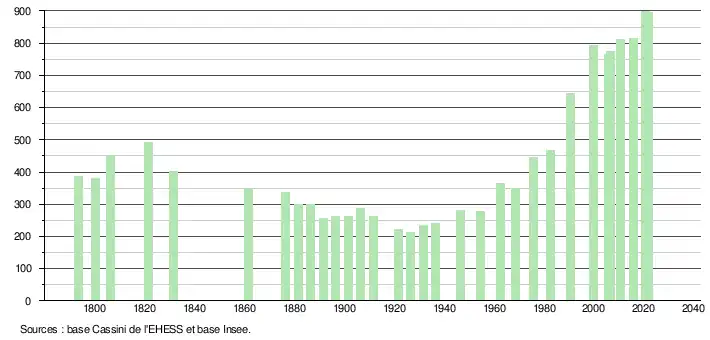 L'évolution du nombre d'habitants est connue à travers les recensements de la population effectués dans la commune depuis 1793. Pour les communes de moins de 10 000 habitants, une enquête de recensement portant sur toute la population est réalisée tous les cinq ans, les populations légales des années intermédiaires étant quant à elles estimées par interpolation ou extrapolation[19]. Pour la commune, le premier recensement exhaustif entrant dans le cadre du nouveau dispositif a été réalisé en 2005[20].