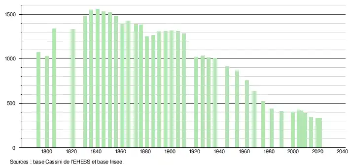 L'évolution du nombre d'habitants est connue à travers les recensements de la population effectués dans la commune depuis 1793. Pour les communes de moins de 10 000 habitants, une enquête de recensement portant sur toute la population est réalisée tous les cinq ans, les populations légales des années intermédiaires étant quant à elles estimées par interpolation ou extrapolation[18]. Pour la commune, le premier recensement exhaustif entrant dans le cadre du nouveau dispositif a été réalisé en 2004[19].