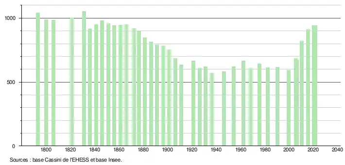 L'évolution du nombre d'habitants est connue à travers les recensements de la population effectués dans la commune depuis 1793. Pour les communes de moins de 10 000 habitants, une enquête de recensement portant sur toute la population est réalisée tous les cinq ans, les populations légales des années intermédiaires étant quant à elles estimées par interpolation ou extrapolation[17]. Pour la commune, le premier recensement exhaustif entrant dans le cadre du nouveau dispositif a été réalisé en 2005[18].