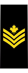 Sur les tuniques, les insignes des grades d'adjudant et de maître de 1re classe à adjudant-chef et premier-maître de 1re classe sont portés sur le bas de la manche tandis que les insignes des grades de matelot, de soldat et d'aviateur à maître de 2e classe et sergent sont portés sur le haut de la manche. Les grades de cette section ont également cours chez les cadets de la marine royale canadienne, les cadets de l’aviation royale canadienne et les cadets de l’armée royale canadienne.