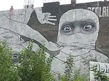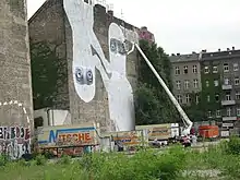 Selon le récit de Henke, le mur noir n'est pas non plus censé être une déclaration d'impuissance, car il a déjà été interprété. Au contraire, c'est une démonstration de la capacité d'agir. Le bon art ou le bon street art se caractérise également par le fait qu'il fonctionne par rapport à une situation et n'est pas simplement illustratif[16]. Le Léviathan, la fresque murale de Blu (également appelée Pink Man, Blu's Backjump Mural), située au bout de la Falckensteinstraße, est toujours présente (en 2015). On marche vers l'incontournable géant rose en quittant l'Oberbaumbrücke en direction de Kreuzberg[17].
