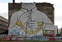 Les deux graffitis de l'artiste de rue italien Blu ont été créés en 2007/2008 et s'étendent sur les pare-feu (murs extérieurs latéraux sans fenêtre) de deux blocs de maisons adjacents à la friche. Blu a créé la première peinture à l'été 2007 dans le cadre de « Planet Prozess », un projet d'exposition sur les arts de rue de l'association artistique berlinoise Artitude[7]. Les deux peintures murales montraient des figures blanches. Un tableau représentait le torse sans tête d'un homme portant une montre en or à chaque poignet. Les montres étaient façonnées comme des menottes et reliées par une chaîne en or. Avec ses mains liées, l'homme redressa sa cravate.