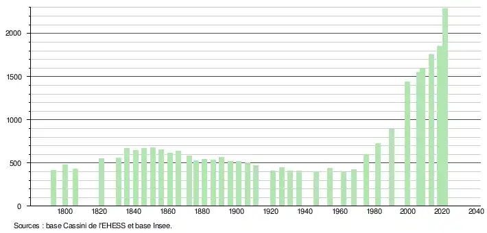 L'évolution du nombre d'habitants est connue à travers les recensements de la population effectués dans la commune depuis 1793. Pour les communes de moins de 10 000 habitants, une enquête de recensement portant sur toute la population est réalisée tous les cinq ans, les populations légales des années intermédiaires étant quant à elles estimées par interpolation ou extrapolation[37]. Pour la commune, le premier recensement exhaustif entrant dans le cadre du nouveau dispositif a été réalisé en 2008[38].