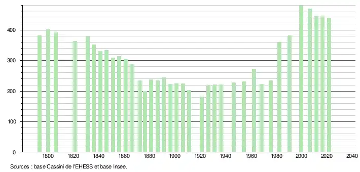 L'évolution du nombre d'habitants est connue à travers les recensements de la population effectués dans la commune depuis 1793. Pour les communes de moins de 10 000 habitants, une enquête de recensement portant sur toute la population est réalisée tous les cinq ans, les populations légales des années intermédiaires étant quant à elles estimées par interpolation ou extrapolation[17]. Pour la commune, le premier recensement exhaustif entrant dans le cadre du nouveau dispositif a été réalisé en 2006[18].