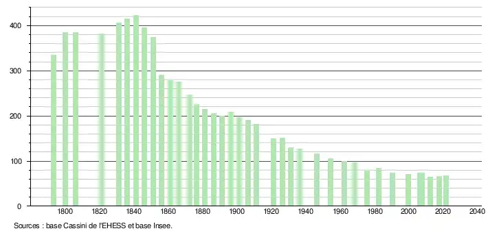 L'évolution du nombre d'habitants est connue à travers les recensements de la population effectués dans la commune depuis 1793. Pour les communes de moins de 10 000 habitants, une enquête de recensement portant sur toute la population est réalisée tous les cinq ans, les populations légales des années intermédiaires étant quant à elles estimées par interpolation ou extrapolation[23]. Pour la commune, le premier recensement exhaustif entrant dans le cadre du nouveau dispositif a été réalisé en 2007[24].