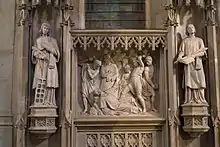 • Lapidation de saint Étienne, XIXe siècle, relief en pierre, flanqué de deux statues, l'ensemble attribué à Joseph-Hugues Fabisch (1812-1886). Les statues sont identifiables comme saints diacres martyrs, par leurs habits et attributs (dalmatique et livre des évangiles du diacre, palme du martyre) : à gauche saint Laurent de Rome, archidiacre auprès du pape Sixte II à Rome appuyé sur le gril de son martyre.