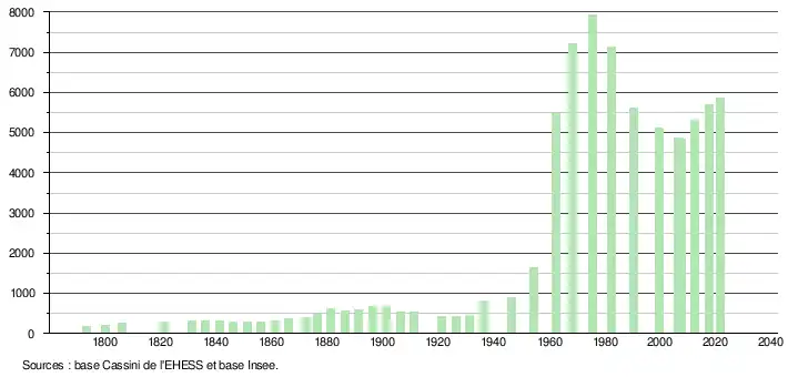 L'évolution du nombre d'habitants est connue à travers les recensements de la population effectués dans la commune depuis 1793. Pour les communes de moins de 10 000 habitants, une enquête de recensement portant sur toute la population est réalisée tous les cinq ans, les populations légales des années intermédiaires étant quant à elles estimées par interpolation ou extrapolation[26]. Pour la commune, le premier recensement exhaustif entrant dans le cadre du nouveau dispositif a été réalisé en 2007[27].