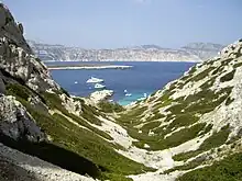 Vue de l'île de Riou depuis la calanque des Queyrons. | |