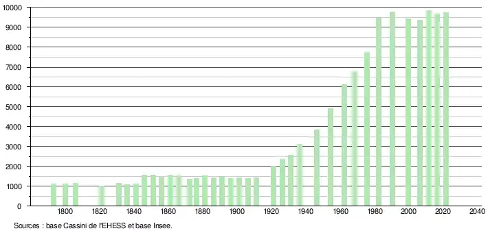 L'évolution du nombre d'habitants est connue à travers les recensements de la population effectués dans la commune depuis 1793. Pour les communes de moins de 10 000 habitants, une enquête de recensement portant sur toute la population est réalisée tous les cinq ans, les populations légales des années intermédiaires étant quant à elles estimées par interpolation ou extrapolation[38]. Pour la commune, le premier recensement exhaustif entrant dans le cadre du nouveau dispositif a été réalisé en 2006[39].
