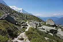 Le Grand Balcon Nord avec au fond les Aiguilles Rouges de l'autre côté de la vallée de Chamonix. | |||