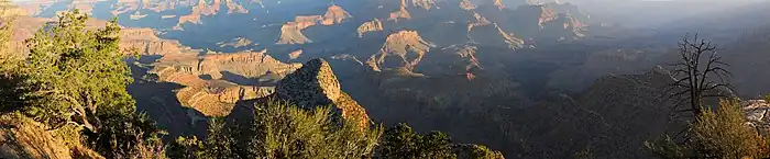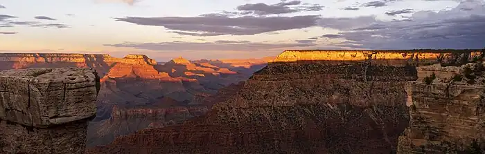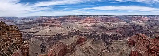 Le Grand Canyon ou Grand Cañon[1], en anglais Grand Canyon, en hopi Ongtupqa, en yavapai Wi:kaʼi:la, est un canyon des États-Unis situé dans le Nord-Ouest de l'Arizona. La gorge a été creusée par le fleuve Colorado dans le plateau du même nom et l'empilement de couches géologiques de Grand Staircase. Fondé en 1919, le parc national du Grand Canyon couvre un territoire protégé de 4 927 km2[N 1]. Il est fréquenté chaque année par plus de quatre millions et demi de visiteurs. La diversité et la singularité naturelle et paysagère du site l'ont fait reconnaître patrimoine mondial de l’Humanité par l’UNESCO en 1979.