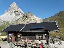 Vue du Filmoor-Standschützenhütte, un refuge de montagne, dominé par le sommet.