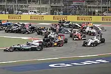 - Lors des qualifications, Lewis Hamilton réalise sa pole position en 1 min 29 s 493, le meilleur temps absolu du circuit international de Sakhir. C'est la première fois que le record d'une des pistes du championnat du monde est battu par une voiture à moteur V6 de 1,6 litre turbocompressé hybride. En 2005, Mark Webber, au volant de sa Williams FW27 à moteur V10 avait tourné en 1 min 29 s 527 lors des essais libres. Michael Schumacher détient toutefois, en 1 min 30 s 159, le meilleur temps en course[24],[25] ;