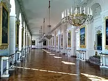 La galerie des Cotelle, située dans l'aile nord, comporte onze portes-fenêtres et cinq fenêtres et est reliée au salon des jardins. Elle tient son nom du peintre Jean Cotelle le Jeune, portraitiste et miniaturiste de Louis XIV qui réalise vingt et une des vingt-quatre toiles qui y sont accrochées[65]. Ces tableaux témoignent de l'état des bosquets du jardin, tels qu'ils sont en 1687, certains ayant aujourd'hui disparu. Napoléon Ier, peu adepte de ces nymphes et putti, souhaite les faire disparaître et les remplacer par des tableaux à sa gloire, mais n'en a pas le temps[j 1]. Louis-Philippe Ier les transfère à Versailles. Ce n'est qu'en 1913 que les œuvres retrouvent leur galerie d'origine. Le traité de paix avec le Royaume de Hongrie y est signé le .