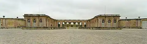 Originellement, le projet de Jules Hardouin-Mansart prévoit de menuiser les arcades sur la cour, ne laissant alors pas deviner le jardin depuis la cour, mais Louis XIV décide en cours de chantier[Note 6] de les laisser libres, mettant en relation visuelle la cour et les jardins[5]. Le péristyle est vitré par Napoléon Ier en 1810, ajouts supprimés un siècle plus tard, en 1910[63]. Les arcades portent encore les traces de cet ajout impérial.