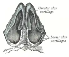 Le grand cartilage alaire[1] est une mince lamelle de cartilage hyalin. Il a une forme de U ouvert vers l'arrière formant une aile médiane et une aile latérale..
