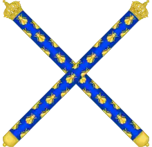 Les ornements extérieurs de ses armoiries sont deux bâtons garnis de velours bleu brodés d'abeilles d'or, dont les bouts d'en haut se terminent en couronnes impériales fermées, passés en sautoir derrière l'écu.