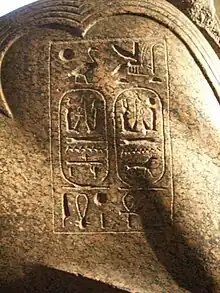 Ce sphinx royal (couché, portant la coiffe Némès, avec une fausse barbe droite) est sur un socle dont les inscriptions originales ont été partiellement effacées, et dont seules sont lisibles celles allusives au pharaons Amenemhat II (XIIe dynastie), Apophis Ier (XVe dynastie), Mérenptah (XIXe dynastie) et Sheshonq Ier (XXIIe dynastie) qui se sont succédé en réutilisant le sphinx.