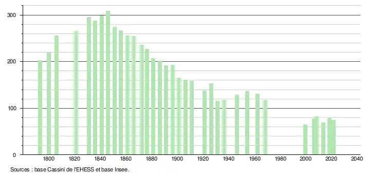 L'évolution du nombre d'habitants est connue à travers les recensements de la population effectués dans la commune depuis 1793. Pour les communes de moins de 10 000 habitants, une enquête de recensement portant sur toute la population est réalisée tous les cinq ans, les populations légales des années intermédiaires étant quant à elles estimées par interpolation ou extrapolation[18]. Pour la commune, le premier recensement exhaustif entrant dans le cadre du nouveau dispositif a été réalisé en 2008[19].