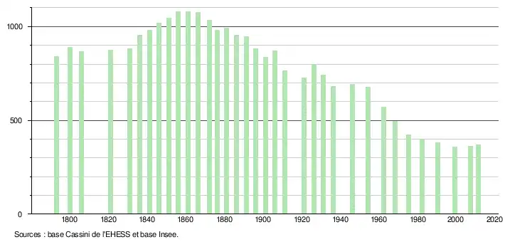 L'évolution du nombre d'habitants est connue à travers les recensements de la population effectués dans la commune depuis 1793. À partir du , les populations légales des communes sont publiées annuellement dans le cadre d'un recensement qui repose désormais sur une collecte d'information annuelle, concernant successivement tous les territoires communaux au cours d'une période de cinq ans. Pour les communes de moins de 10 000 habitants, une enquête de recensement portant sur toute la population est réalisée tous les cinq ans, les populations légales des années intermédiaires étant quant à elles estimées par interpolation ou extrapolation[19]. Pour la commune, le premier recensement exhaustif entrant dans le cadre du nouveau dispositif a été réalisé en 2007[20],[Note 2].