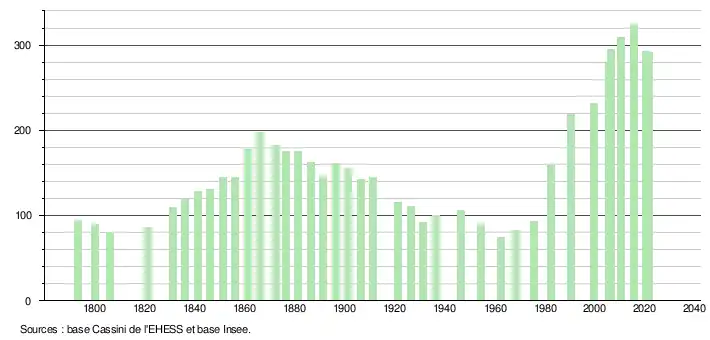 L'évolution du nombre d'habitants est connue à travers les recensements de la population effectués dans la commune depuis 1793. Pour les communes de moins de 10 000 habitants, une enquête de recensement portant sur toute la population est réalisée tous les cinq ans, les populations légales des années intermédiaires étant quant à elles estimées par interpolation ou extrapolation[20]. Pour la commune, le premier recensement exhaustif entrant dans le cadre du nouveau dispositif a été réalisé en 2005[21].