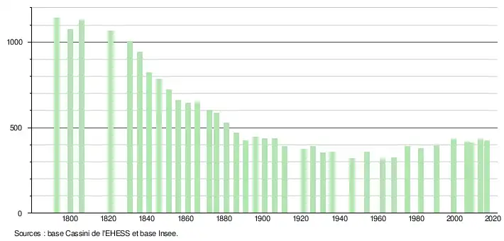 L'évolution du nombre d'habitants est connue à travers les recensements de la population effectués dans la commune depuis 1793. Pour les communes de moins de 10 000 habitants, une enquête de recensement portant sur toute la population est réalisée tous les cinq ans, les populations légales des années intermédiaires étant quant à elles estimées par interpolation ou extrapolation[6]. Pour la commune, le premier recensement exhaustif entrant dans le cadre du nouveau dispositif a été réalisé en 2008[7].