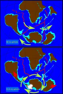 - à l'installation de la calotte polaire sur le continent Antarctique qui dure jusqu'à nos jours : l'isolement du continent antarctique qui, d'un côté, se détache de l'Amérique du Sud (passage de Drake) et, de l'autre, de l'Australie (passage tasmanien (de)), est à l'origine d'un courant autour de l'Antarctique et de vents violents (quarantièmes rugissants et cinquantièmes hurlants)[7] ;