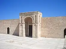 L'entrée principale, située au centre du mur nord et flanquée de deux petites ouvertures, est marquée par une grande arche reposant sur des pieds-droits et couronnée par un court attique. La solennité du portail est renforcée par la simplicité des moulures qui partagent les surfaces et la décoration : arcatures aveugles et outrepassées dans le registre inférieur et niches[3] dans le registre supérieur de l'archivolte, qui reprennent le motif profilé de la corniche. À l'intérieur se trouve une grande cour entourée d'arcades sur les quatre côtés. Le portique nord conserve sa voûte à ogives originale, reposant sur des piliers en pierre, tandis que le reste est constitué d'arcs outrepassés reposant sur des colonnes corinthiennes : individuelles à l'est et à l'ouest, géminées au sud et en façade de la salle de prière.