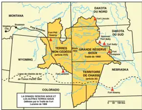 - Une zone de chasse à l'extérieur de la réserve, dans la zone limitrophe du Nebraska (article XI) et une zone réservée s'étendant dans le Wyoming, le Montana et le Dakota du Nord. Ce territoire n'est pas considéré comme cédé par les tribus amérindiennes (unceded land) et n'a pas le droit d'être colonisé par les Blancs (article XVI)[2] ;