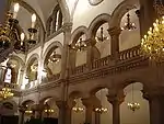 Un petit vestibule, ouvert sur la cour par trois arches à arc plein cintre, permet d'accéder à la salle de prières par trois portes en bois. Cette grande pièce rectangulaire est divisée en trois parties : la nef centrale, de la hauteur du bâtiment ; et de chaque côté les collatéraux, moins hauts, séparés de la nef centrale par douze colonnes rappelant les douze tribus d'Israël. Chacune des colonnes est surmontée d'un chapiteau de style différent corinthien ou composite. De chaque côté, au-dessus des collatéraux et au-dessus du vestibule d'entrée, se trouve la galerie réservée aux femmes, avec balustrades à colonnettes en pierre.