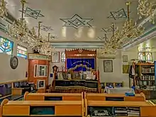 Façade de la Grande synagogue de Tunis avec le tétragramme YHWH au sein de l'étoile de David. | |