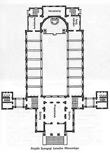 De chaque côté de l'Arche sainte, une porte mène au bureau du rabbin et une autre à une salle de repos. La synagogue fait appel régulièrement aux meilleurs chœurs du monde qui chantent, accompagnés de l'orgue et de différents instruments musicaux[2]. Mieczysław Orłowicz écrit en 1922 : « Le vendredi, lors de l'office du soir, des chœurs excellents accompagnés d'orgue. (admission aussi possible pour les hommes chrétiens au rez-de-chaussée en gardant leur chapeau sur la tête, et pour les femmes dans les galeries) » [7].
