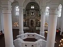 Dans le hall de prière, quatre colonnes ioniques élancées soutiennent un plafond divisé en neuf voûtes quadripartites. Sur chaque clef de voûte, un médaillon en stuc à quatre lobes, datant du XVIIIe siècle a pu être préservé. Ils représentent les symboles de la fête de Souccot, des légumes, un aigle, un daim et un coq de combat.