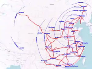 Le réseau des lignes à grande vitesse chinoises se situe de loin au premier rang mondial atteignant plus de 38 000 km de longueur en décembre 2020[16] (42 000 km fin 2022).