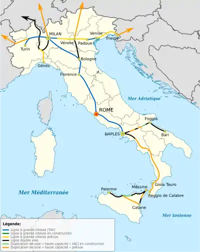 Le système AV/AC Grande Vitesse/Grande capacité italien se développe avec environ 1 487 km[8] (2019) de voies (interconnexions comprises) le long des axes ferroviaires les plus fréquentés et les plus saturés du pays à travers la transversale Turin-Milan-Venise, la dorsale Turin-Milan-Rome-Naples, avec son antenne vers le port de Gênes, et donc au-delà de 2 000 km le long des liaisons avec l'Europe du nord, à travers les cols des Alpes, et avec le sud de l'Italie, entre Naples, Bari et Reggio de Calabre jusqu'à Palerme, en Sicile en traversant le Pont de Messine.