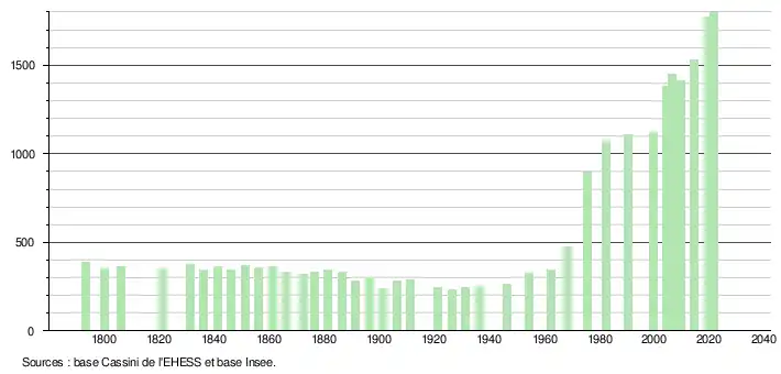 L'évolution du nombre d'habitants est connue à travers les recensements de la population effectués dans la commune depuis 1793. Pour les communes de moins de 10 000 habitants, une enquête de recensement portant sur toute la population est réalisée tous les cinq ans, les populations légales des années intermédiaires étant quant à elles estimées par interpolation ou extrapolation[17]. Pour la commune, le premier recensement exhaustif entrant dans le cadre du nouveau dispositif a été réalisé en 2004[18].