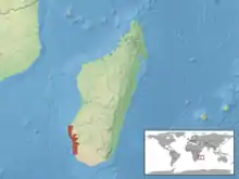 Cette espèce est endémique d'Atsimo-Andrefana à Madagascar[1],[2]. Elle se rencontre vers la Forêt des Mikea, Tsimanampetsotsa et Tsimanampetsotsa entre 50 et 100 m d'altitude.