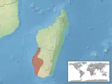 Cette espèce est endémique du Sud-Ouest de Madagascar[1],[2]. Elle se rencontre dans les régions d'Atsimo-Andrefana et de Menabe entre le niveau de la mer et 690 m d'altitude.