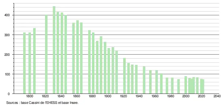L'évolution du nombre d'habitants est connue à travers les recensements de la population effectués dans la commune depuis 1793. Pour les communes de moins de 10 000 habitants, une enquête de recensement portant sur toute la population est réalisée tous les cinq ans, les populations légales des années intermédiaires étant quant à elles estimées par interpolation ou extrapolation[16]. Pour la commune, le premier recensement exhaustif entrant dans le cadre du nouveau dispositif a été réalisé en 2004[17].
