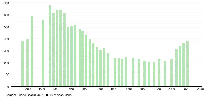 L'évolution du nombre d'habitants est connue à travers les recensements de la population effectués dans la commune depuis 1793. Pour les communes de moins de 10 000 habitants, une enquête de recensement portant sur toute la population est réalisée tous les cinq ans, les populations légales des années intermédiaires étant quant à elles estimées par interpolation ou extrapolation[19]. Pour la commune, le premier recensement exhaustif entrant dans le cadre du nouveau dispositif a été réalisé en 2006[20].