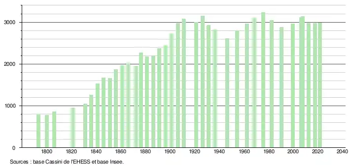 L'évolution du nombre d'habitants est connue à travers les recensements de la population effectués dans la commune depuis 1793. Pour les communes de moins de 10 000 habitants, une enquête de recensement portant sur toute la population est réalisée tous les cinq ans, les populations légales des années intermédiaires étant quant à elles estimées par interpolation ou extrapolation[23]. Pour la commune, le premier recensement exhaustif entrant dans le cadre du nouveau dispositif a été réalisé en 2007[24].