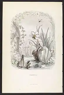 Les Fleurs animées est un livre illustré par Grandville et dont les textes ont été écrits par Alphonse Karr, Taxile Delord et Foelix Comte. Publié en 1847, l'ouvrage comprend deux bois et cinquante gravures sur métal. Les textes sont de natures très diverses, allant d'un thème musical à des parodies de dialogues de Platon[29]. Les illustrations reflètent bien le style et l'univers de Grandville, puisqu'il s'agit de fleurs anthropomorphisées et dessinées dans une petite scène. Nénuphar, Myrte, Laurier, Camélia, Rose, Trèfle, Aloès, Acacia Saule Pleureur, Aubépine, Lin, Fleur d'Oranger, Pavot, Perce-Neige, Primevère, Coquelicot, Lis, Pensée, Tabac, Narcisse, Violette, Chèvre-Feuille, Immortelle, Marguerite, Belle-de-Nuit, Œillet, Chardon, Eglantine, Capucine, Guimauve, etc., s'incarnent ainsi dans les illustrations de Grandville et composent les différentes protagonistes des Fleurs animées. Les caractéristiques et attributs de chacune des fleurs lui permettent ainsi de créer ses personnages.